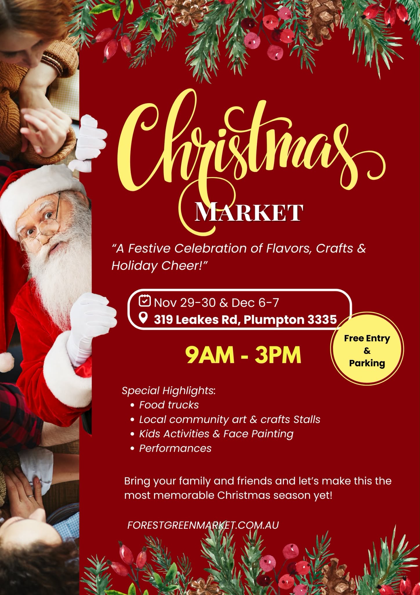 We're super excited to announce that the Christmas Tree Farm Markets are returning for 2025 — bigger, better, and more magical than ever! 🎅🎁 Due to popular demand, we're hosting TWO massive weekends of festive fun! 📅 Event Dates & Times: 🗓 Saturday 29th November & Sunday 30th November 🗓 Saturday 6th December & Sunday 7th December 🕘 9am – 3pm each day 📍 Location: Melbourne Christmas Tree Farm 319 Leakes Road, Plumpton 🎄 FREE ENTRY & FREE PARKING! ✨ What's On ✨ Get ready for an unforgettable festive experience the whole family will love! 🎅 Meet Santa and capture magical Christmas memories 🎶 Live entertainment & local dance groups performing throughout the day 🎨 Kids' activities galore! Face painting, bouncy castles, animal farm & cookie/cupcake making stations 🛍 60+ indoor & outdoor stalls featuring handmade gifts, homewares, plants, treats & more 🍔 Delicious food trucks & coffee vans serving festive favourites 🌲 Pick up your very own REAL Christmas tree while you're here! 💚 Event Highlights ✅ Free entry & parking 🐾 Dog friendly ♿ Wheelchair accessible 🎵 Entertainment for all ages 🚗 Only 30 minutes from the city 🌳 Enjoy a walk through the largest Christmas Tree Farm in Australia This is the perfect day out to shop local, support small family businesses, and soak up the festive cheer with family and friends!