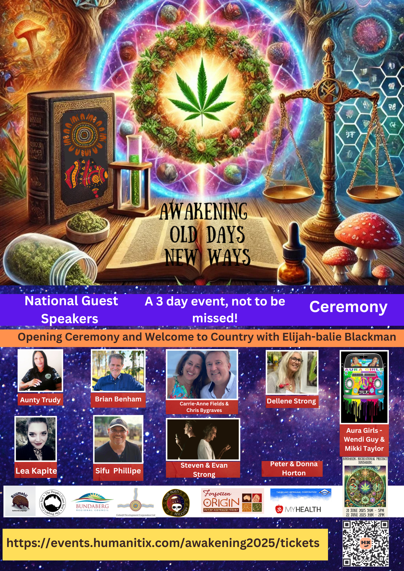 Awakening returns to Bundaberg in 2025 after a very successful and enlightening event for all that attended in 2024. Programme info for 2025, details to come Friday Evening from 5pm: Welcome to Country & Smoking Ceremony presented by Elijah Blackman Saturday 9:00-9:15 Introduction 9:15-10:15 Steven and Evan Strong: Alien bones and business 10:15-11:15 Lea Kapiteli: Alien lifestyles, attitudes, advice and organisations 11:15-11:45 Morning Tea: 11:45-1:00 Carrie-Anne Fields and Chris Bygraves: Old Way IS the New Way Is Old Earth really New Earth for some? 1:00-2:00 Lunch 2:00-3:00 Brian Benham: Psilocybin (Medicinal Mushrooms) 3:00-3:15 Afternoon Tea 3:00-4:30 Peter Horton and Donna Markewell: Common Law-the legal system for the future. Sunday 9:00-9:10 Introduction 9:10-9:50 Lea Kapiteli: Atlantis at its Zenith: Heaven on Earth 9:50-11:00 Aunty Trudy Roberts: The Original Old Ways-the only path forward for the New Days 11:00-11:30 Morning Tea 11:30-12:50 Sifu Phillips: The practicalities and realities of Earth Magic 12:50-1:50: Lunch 1:50-2:50: Medicinal Cannabis: Del Strong in conversation with Steven Strong Surviving the worst liver cancer with best medicine 2:50-3:10: Afternoon Tea 3:10-4:30 Steven and Evan Strong: Sacred rocks, the magic, the mystery and First Language Tickets available here https://events.humanitix.com/awakening2025/tickets